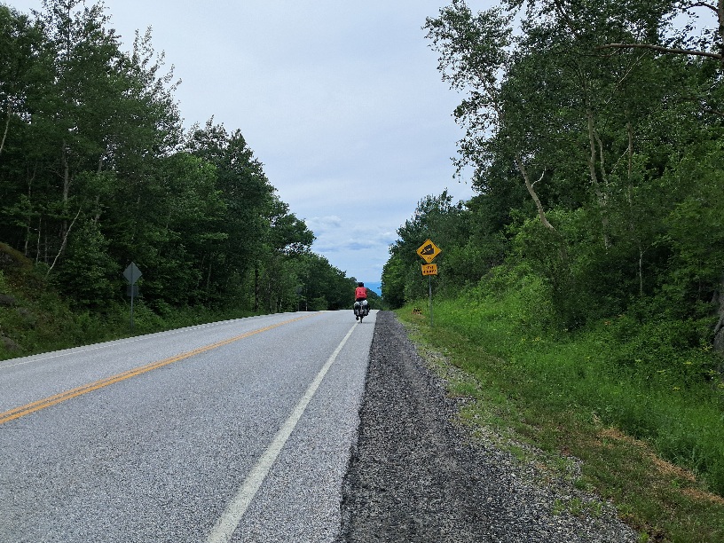 We left Henderson's Hideaway at about 9.30am, the sun shining and only a hint of mosquitoes around the tent. We stopped at South Royalton for additional carbs and found them in the form of maple cheese bread - delicious, worth finding a recipe for. Bread whirls soaked with maple syrup and somehow with cream cheese too. A local on a bike chatted to us - he had already done 17 miles on his morning bike ride and was going to reach 30 miles by th time he got home. He was wearing am Alaska cycling shirt, same as one seen on our first transam. It turns out that his daughter lives in Alaska and he recommended the cycle trails there. Off road presumably. I asked about winter here - can he do his bike ride? He said winters were getting slushy rather than heavy snow. We felt a touch of climate guilt when we said we were from the UK (but we haven't flown for the previous ten years, it's in our carbon 5 ton budget.). We should all have a carbon budget... We set off for the long preliminaries to get to our last biggish climb in the Appalachians - the Brandon Gap. So we went via Rochester then up and over quite a steep climb, short stop at the top, then a wonderful downhill to Brandon (37.2mph at the max - quite enough. At Brandon we eventually worked out that we were too late to get the ferry we need and that's 20 miles away. The library has free wifi and so helped enormously. (This phone is finding very little t mobile coverage in New England.) There's no camping sites near the ferry. So we hauled up at the Country Village Campground - excellent value at $35 with a swimming pool- used shortly after arrival - and excellent showers. And I've even managed to charge this phone. Dinner was another large salad with grainy bread. Today, like yesterday, we have drunk litres of water and orange due to the heat. Bigger mileage tomorrow.The photo shows Guy by a sign that promises 4 miles of 1 in 8.... that downhill gave me my topspeed so far c. 38mph