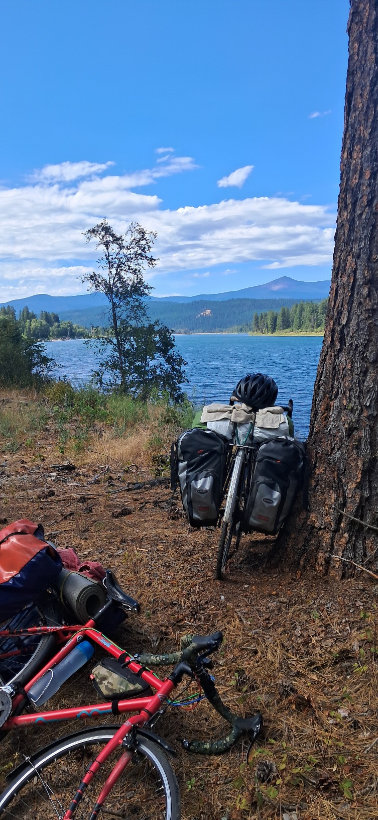 Today was a pleasant day's cycling along quiet and fairly flat roads in warm sunshine with just a few minor hills. And Cedar RV Park is excellent - just what you want in a campground (water, electric gadget charging, showers and flush toilets, all very clean). We left the campsite at about 9.50am and noticed that we had a light following wind and flattish road. So the miles sped by. We followed N Leclerc Road which soon passed through a native American reservation - looked sufficiently prosperous. Unfortunately we were then chased by two largish dogs which darted out of a yard. This seems to be more prevalent on reservations I'm afraid - loose dogs. The were shouted at by me until they gave up, Guy has an impressiveway of just ignoring them and proceeding steadily. They may have been hit by pepper spray in earlier encounters because they were careful to avoid getting closer than about four feet, easy spraying range. This put me in such bad mood with the area that we sped past a cave that was used for Christian Native American worship, the Manressa Grotto. From what I've read it's an interesting mix of traditional Christian themes and Native American culture, bound to be an interesting thing... The road hurtled us along, with only a brief riverside stop for lunch - the River Pend Oreille. The river is named from one of the tribes of the area as named by early French explorers - the earring tribe I suppose in English. The river is very much a pleasure craft river with lots of landing stages along the banks, mountains in the distance. We completed 49 miles as we reached Ione, with an impressive average speed of 13.1mph, just after 2pm. A very early finish but the next stop is some way off and we need a campsite with showers and electric charging for the phone after two days with neither of these things. Just as we completed our campsite paperwork two other cyclists arrived, Jonathan and Joe from Denver, doing the Selkirk Loop, a well known route that takes in a large area of northwest USA and Canada. They are camping next to us on a comfy lawn. Maps have been looked at - especially maps of the Washington coast that we'll reach in about a week. They've nearly finished their ride, which includes gravel as well as tarmac. They've done some serious climbing. The climbs that we're about to do had also been done in the past. It was very heartening to meet to such enthusiastic cyclists after a couple of tougher days on our route, and it's a help with planning what to do at the coast. Rain is forecast overnight with some thunder. [Later...] the rain and thunder did turn up so sleep was interrupted but not too bad. It is still raining as I type but the forecast is for it to stop soon. We've got a proper 1000' climb so it'd be nice if we could climb in the dry. We are here.