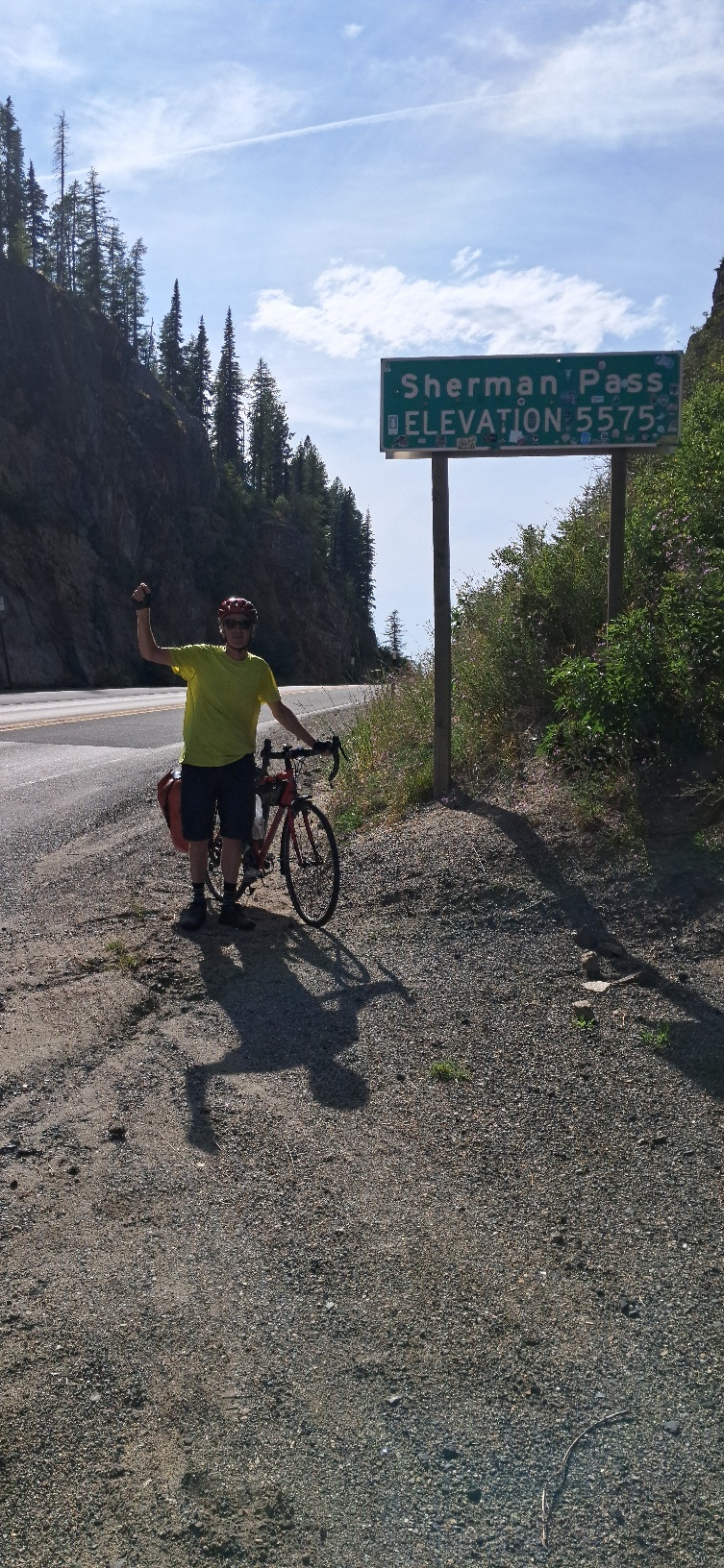 Sleep was not something that the park at Kettle Falls really offered - just too much noise. I recorded yet another train - beautiful as a sound but not a soothing going to sleep sound. But the cars were severe and continued throughout the night. Ear plugs would be a help though in city parks I like the idea of being able to hear if there's anyone hanging around near the bikes at dead of night. I think Kettle Falls is pretty safe though and this morning  we chatted to Pete who lives nearby and sees the yearly flow of cyclists through the park. Some larger groups visit - no luggage sometimes (since they've got a luggage vehicle), carbon bikes, etc. He's been a farmer and racing car techie. We discussed politics. His view was that the coastal states' Democrats will outweigh the more rural based Republicans in the coming elections - particularly if the turnout is high, Kamala Harris might then be the first woman president. That would be a landmark in American politics. Pete is of Japanese origin via his grandparents but has not been to Japan, indeed he's very American  - and evidently America works as a country partly because ethnic origin is subsumed underneath solid American identity.. Although the family moved from Japan in the early 1900s they were still interned in the Second World War. Guy took heart from Pete's optimism about world affairs. We had a big climb to do so we had to get going, via a cake at the grocery store. We cycled down to the Columbia River, hidden away in the reservoir - Lake Roosevelt - that now fills the valley. Then about 4 hours of climbing to the top of the Sherman Pass. Slow indeed but we'll graded - we did about a 1000' per hour. We are rather too heavy to do much more. Today's average speed was 8.5mph! That was the result of a slow ascent of the Sherman Pass. We reached the Sherman Pass - 5575' - at about 3pm and had a late lunch to celebrate reaching the top of our biggest climb of the  transam - 4000' of climbing (though our highest point was the Logan Pass, 6646', back in Glacier National Park). The views are of large wooded mountains, evidence of forest fires abounds - various regrowth  colours of different aged trees. Some fairly huge trees though not yet as big as the redwoods in California ten years ago. Hope to see some coastal redwoods but I expect they need a lot more rain than is usual here so they'll be the far side of the Cascade Mountains. There was a big fire here in 1988 and occasional smaller ones since. It is dry here, sheltered by the coastal ranges from much rainfall. The photo shows how late it was at the summit - the sun was shining from the west, behind me.... Surprisingly for such a challenging climb, there were no other cyclists at any point, either on our ascent or descent - which was mostly a nice steady downhill and so not too much braking. The wheels have done over 4000 miles now - mine a lot fewer than Guy's since my wheels were new in June. But hard braking for miles of downhill does wear out rims - Wales is particularly bad since in some areas you are either slogging uphill or braking on a twisty downhill. Not much traffic either. We reached a campsite - Golden Mtn RV that looks great for camping - has a clubroom so great for rainy weather and decent grass for camping - but no-one was around c. 5pm so we tried the Ferry County Fairground ($15 per night) and were as delighted by the lush grass and quiet, plus water, toilets and showers ($1.75 for a shower of 3 mins duration, lots of quarters...). And there are solid pavilions to shelter in - we've noticed rain creeping into the forecast for tomorrow and the next day and we might sit tight until we can do our Cascade Mountain climbs in sunshine.... Slept extremely well - after hardly sleeping at Kettle Falls. We are here.