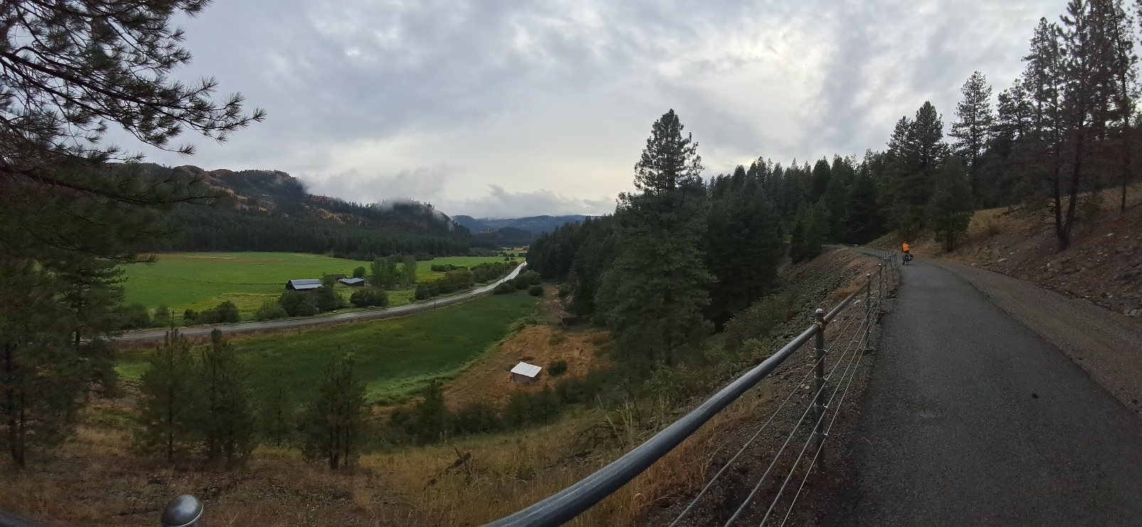 The rain continued all day today, sometimes heavy though mostly just moderate steady rainfall. I finished Plainsong, the novel I started yesterday, such are the benefits of rain, and then downloaded Domestic Manners of the Americans by Fanny Trollope, published nearly two hundred years ago in 1832. I have already read about half the book. Set before the civil war, topics such as slavery loom fairly large, as do politics, male habits such as spitting and drinking whisky. She has only visited the eastern side of the country - largely in the vicinity of  Washington DC, Baltimore and Philadelphia. Still very readable and full of witty observations. The rain ceased at about 6pm and we went shopping for dinner. The photo shows the rather damp scene viewed from the bike trail. On the way back there were even some hints of blue in the sky so it bodes well for getting over the next pass tomorrow. The current temperature though is only 10 centigrade and the air is damp and the temperatureis falling.... We are still here. [Later...] We've been surprised by the very early arrival of large campers - big caravans - for a horse event plus cattle show that all starts on Tuesday.  Early eh? It is evidently a tradition to spend a day or two here before the show. We've packed up our tent to allow them into the tiny space occupied by our tent. These big vans need a lot of space - by tomorrow evening  the place will be full, we just happened to pitch on the very spot the first arrivals had booked or perhaps they were bagging the best spot. I think technically you can't arrive before 11am, check out time for the previous day, but we can have an early start... and this is evidently a local tradition.