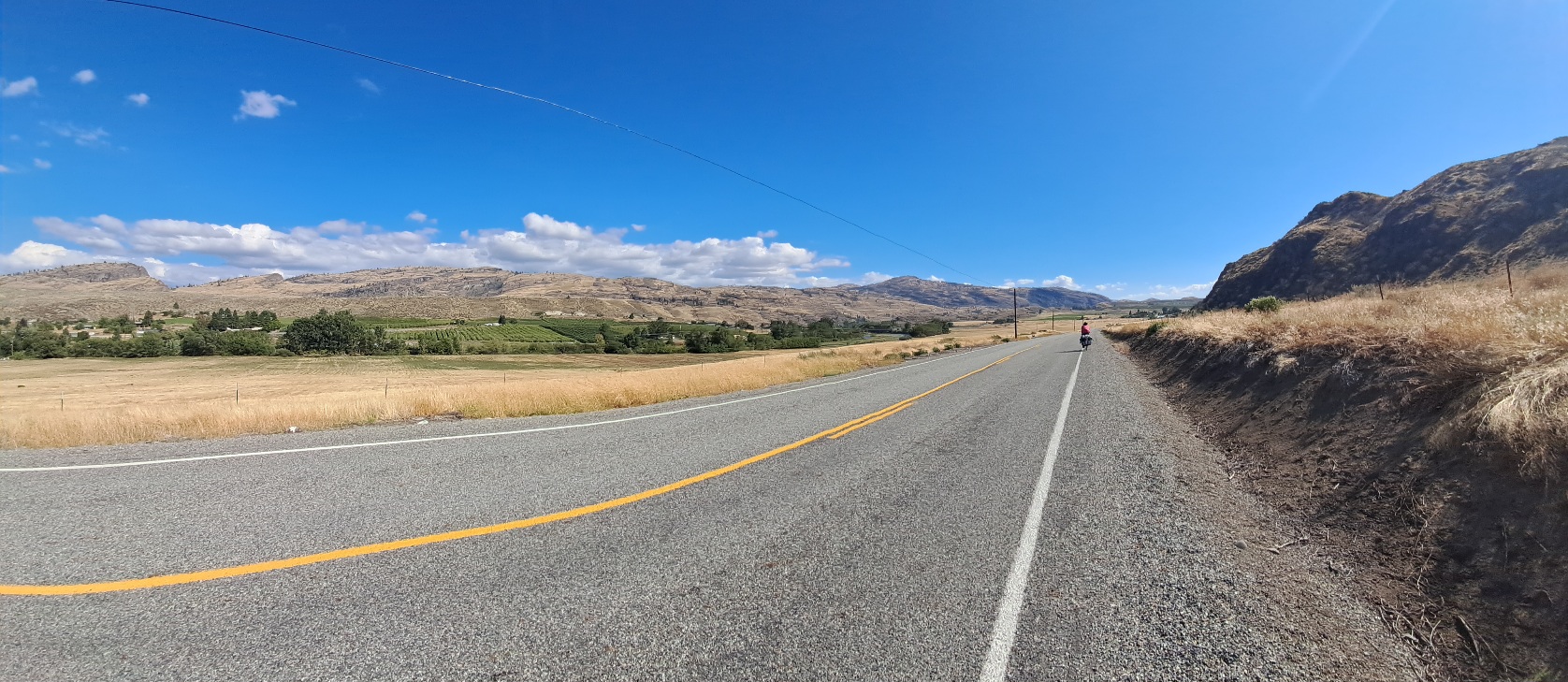 Although I wouldn't choose to leave a campsite early simply because of an influx of early arrivals in huge caravans trying to get a good spot ahead of the crowds, it did at least give us a 9am start on a fairly long day of cycling - initially over a low pass - the Wauconda Pass, which is a mere 4310' so not quite a full Ben Nevis, and, of course, we started at about 2000' at Republic since it is a fairly high up town. It didn't seem a tough climb at all. Then down past Wauconda which is hardly a town at all. After Wauconda the road continued down but amongst some sad poverty - shacks or trailers sat amongst a mess of broken old cars and pickups with a few dogs loose behind (we hoped) a decent bit of barbed wire. The descent was great and our 40+ miles to Tonasket was done by about 2pm in spite of food shopping at the start and a long, if gentle, climb. The map warned us about a dangerous section of road - 0.8 miles with a poor surface, winding, no hard shoulder to allow traffic to overtake - but that whizzed by on our downhill hurtle. If we had done the section uphill - going east) it would have been much more difficult. The land looks parched since the moisture from the Pacific lands on the Cascades and doesn't reach here. After Tonasket the bottom of the valley is quite green with fruit trees due to an irrigation scheme - but the hills above the valley remain arid and parched, a strange contrast (made me think of an old man wearing a brunette wig - the odd contrast). The valley has a rather austere beauty. Barren hills running above the fertile fields. We saw more poverty going from Riverside, our next town, to Omak - two or three houses where the entire contents of the house were scattered around the wrecked building, with a broken vehicle or three added in usually. This was a Native American reservation. Fortunately there were some well kept areas where people were taking some pride in their neighbourhood - though a few roses or shrubs would not have come amiss - they need a gardening project. We reached Omak, noted the overpriced motel, opted to camp at the RV Park. The snag is that they require online only reservations when the mobile signal here is very weak and they don't give you the wifi password to help you. It is the most absurd thing. Eventually a very kind camper in a nearby caravan told us the wifi password and I could reserve our spot (the booking system worked best with the chrome browser - and the tent had been up for ages by then). And the showers are locked up a bit before 9pm, just a bit before you would want to take shower to remove the dust of 70 miles cycling. There's evidently a reasonable fear of vandalism and theft - the supermarket checkout man said 'bring your bike inside for safety next time'. The area has a fair and reassuring number of police around - and the bikes are locked up right by the tent. At moments it was like cycling through dear old Bradford, West Yorks. We did meet a fellow resident, at the moment, of the RV Park. Scott is moving in locally with his wife and is here until the house is ready. He is the person who helped us log in to the wifi so we could reserve our spot and gave us a couple of very welcome beers - a super beer called Night Owl from Elysian Brewery, a pumpkin ale. Well I love pumpkins. That is exactly what we need, it was nice talking to a fellow cycle enthusiast too, La Vuelta, the Spanish bike race, is on... We saw no bicycles out on the road today though Tonasket to Riverside could be a nice easy journey for a fun day out - with a cafe stop in Riverside. Scott has Scottish roots - going back to the Lowlands some considerable time ago - Roxburgh. The sprinkler system seems to be on at near midnight, hmmm, hope it doesn't reach our site.... We are here. [Later] The sprinkler system did not reach our tent, sleep was not too bad though we are about 200 yards from a busy road.