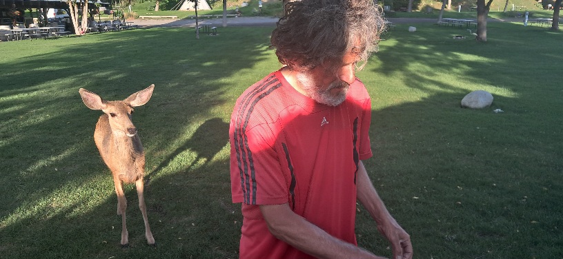 We've met two Canadians, also camping here, doing a route, of about a thousand miles, with some gravel, around the Pacific Northwest - Danielle and Richard. They came over the Washington Pass, from Diablo Lake, today. Their route has included British Columbia and Washington - they are from Victoria, BC, which they say we'll be able to see across the water when we reach the islands in Puget Sound. We also met another older Canadian who discussed the politics of the UK, Canada and the USA He didn't have much time for Trudeau (Canadian PM, who I'd thought was a decent PM, but I am no expert) - apparently he was rude about Trump... Is that a negative though? He didn't know Sunak had been ejected from power in the UK. Sir Kier Starmer is still in his honeymoon period so we'd got nothing to say yet as to how he's doing, it's a very tough assignment, probably impossible. This is a great campsite - for around $30 we get comfy grass, excellent showers and toilets, and access to a kettle and microwave. This puts it up there with the best. Who needs KOA (there's one nearby) when you can have all this for $30? We are here. The pictures are of the Loup Loup Pass summit and, lower down, of Guy being pestered for food by a cute large eared deer. It heard the crinkling of his plastic bag and, just like a dog, took that as a sign of food. He held firm - deer are not (yet, anyway) pets. It is great to see them full of life when we see so many of the likeable creatures dead from traffic collisions at the side of the road.