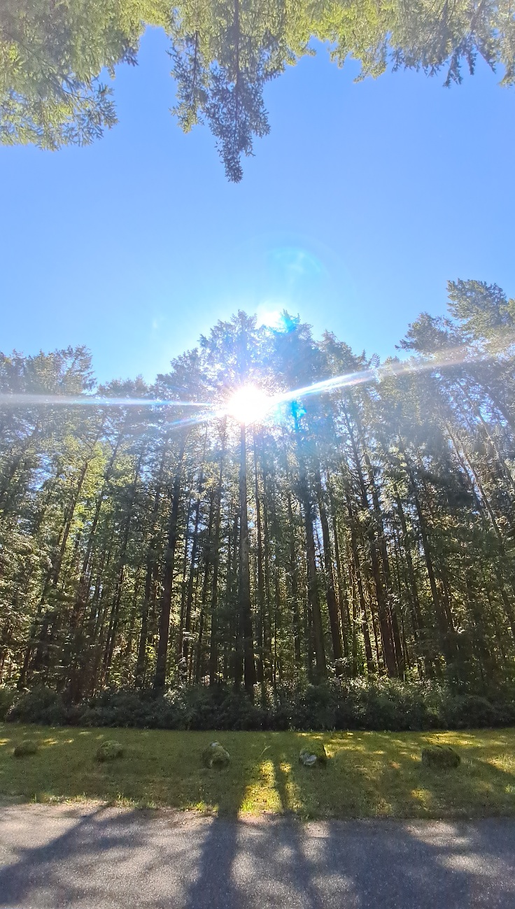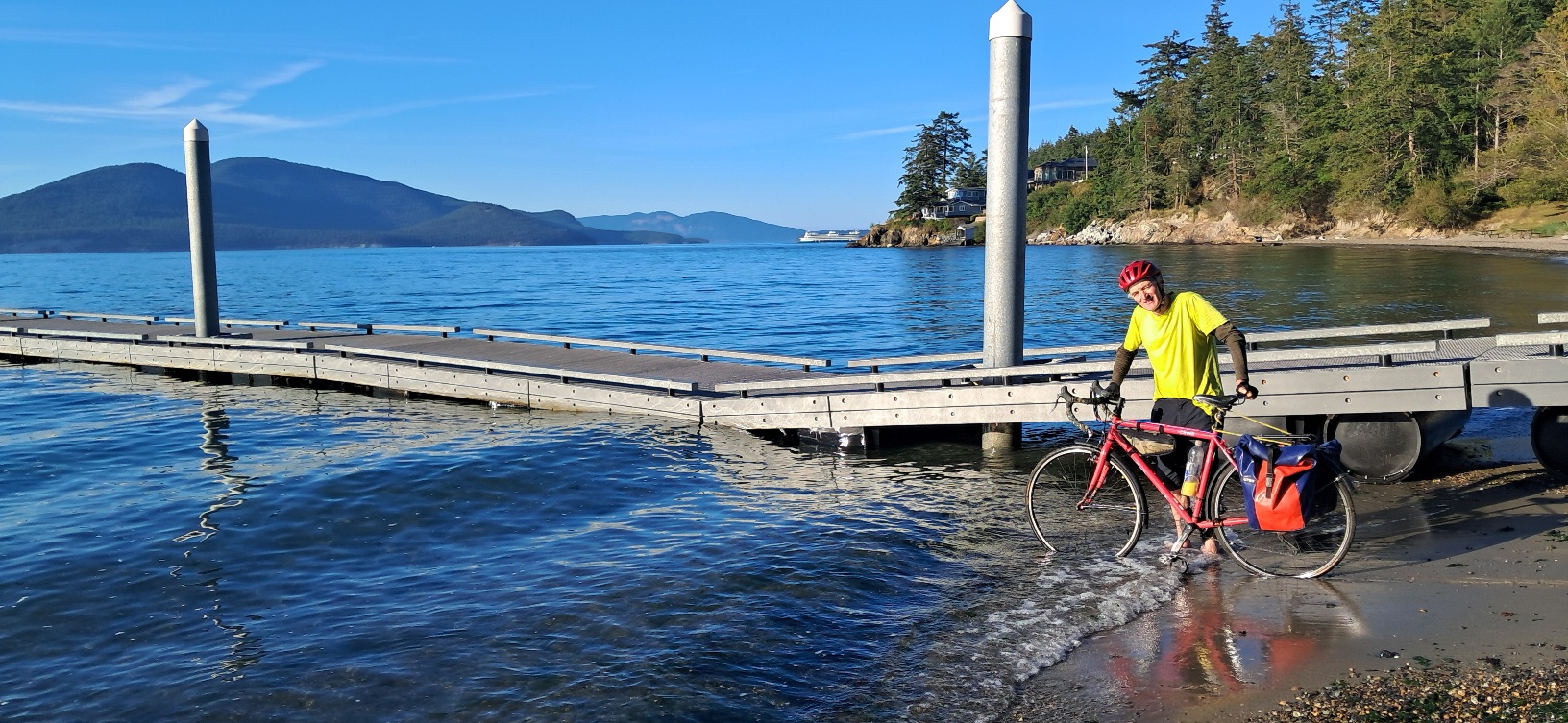 Then lots of bikes as we went along the dedicated cycle route into Anacortes, Americans do much prefer to cycle on a dedicated bike path, then oil tanks (Sinclair petrol stations) and a refinery, new motor boats for sale in a long line, my back wheel sounding a bit odd as if a leaf was trapped in the mudguard, but no leaf could be seen, then finally a push towards Washington State Park along Sunset Avenue because we know there's a hiker biker area which is unlikely to be full.... yes there was space, in fact no-one else was there. Later a hiker turned up - doing 20+ miles a day on a trail that takes in the Washington coastline - he's put up a neat small tent. My back gatorskin tyre has finally started to disintegrate after over 4000 miles - that was the odd sound that the back wheel was making. Hooray for the spare, carried a thousand miles or so, which I'll fit tomorrow. I did the ritual dip of my wheels in the salty sea at the boat launch here - a lovely spot with views of the ferries between Anacortes and the San Juan islands - which we will visit on the way to Seattle. Then we shopped at Old Salts Grocery (no apostrophe...) and a Founder's Porter beer was drunk to celebrate reaching the sea. Our mileage for this trip is 4346 miles crossing the USA but we've got some miles meandering down to Seattle so I'm hopeful of 4500... The photos are of my wheel dip and the tall pines lining the quiet road near Hamilton. We are here.