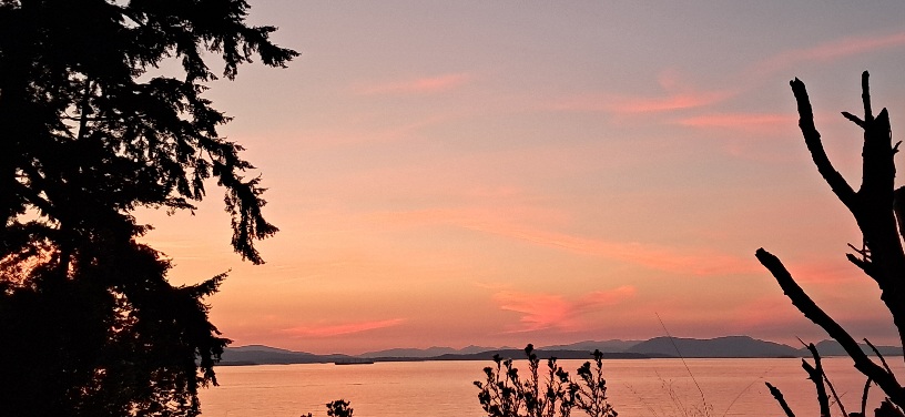 Staring out to sea makes you aware of the considerable amount of container traffic there is heading up the straits to Vancouver. Huge ships pass the campsite day and night, their distant beating engines vibrating the air for an age. Fridges from China, along with a small sea of plastic toys, gadgets, stuff... Wonder what the effect on the whales is? I wake up to hear them.... We also had some time to consider how wandering a route to Seattle we should take - at least two days but perhaps a little more, possibly joining the route from 20 years ago - certainly enjoying the same bainbridge park for camping. On the other hand, urban pleasures of bookshops, art galleries, gardens, museums and veggie restaurants have been much missed and there's a wooden boats festival we may well want to spend time at - in Port Townsend... We are still here. [The next day] As we were packing up a group of dark shapes about half a mile out to sea, where the deep channel is, moved to our left, south, just breaking the water, a pod... Well it may have been orcas, something oceanic...