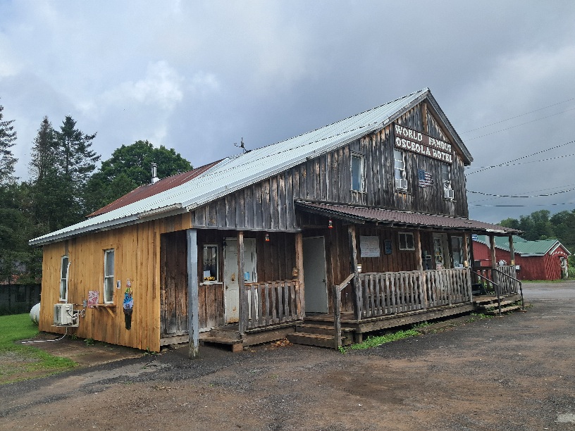 I retrieved our food from the office fridge and even posted the last two blog posts, all before breakfast. Unfortunately although yesterday was a superb summer day, there was rain from the early hours which woke me up. It eased off at about 10am and that was enough to get us on the road. We got a bolt from the Mountain Man shop - recommended for getting bikes fixed. Then proceeded in the steady rain. We reached Mckeever early enough - the tendency is still downhill- then down the Moose River Road but missed the vital turning for the Booneville Road... When we reached Port Leyden we realised that we had gone off piste and so took the state Road 12 to Booneville, 8 mile detour into a headwind with steady rain. Then to Leyden where I realised my tyre was going flat so changed the tube. Then six miles later another puncture. Seemed unconnected with the first but perhaps two bits of one piece of metal. But that has used up all our spare tubes and our repair kit has no solvent courtesy of airline flight rules. Hmm. Just a few instant patches.... Reached Osceola and then found the campsite three miles out of town. Raining very heavily now. We were encouraged to use the pavilion to sleep in- given the forecast. And so that's where I am now typing away. Just hope we have no punctures tomorrow and the rain eases off. Sun would be nice. This is snowmobile territory in winter, people dressed in snow gear flying over snowdrifts.