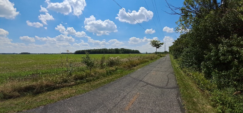 The Great Lakes moderate the temperatures around them and as you leave them temperatures may well rise as they did when we left sea breeze Vermilion and then Huron and headed inland. It has been a hot and humid day. We are plastered with sun lotion (factor 30 initially but I saw some factor 100 so it's more of a sunblock...!), wearing dark glasses, shorts and cycling T shirts. The cycling is now flatter ( even) and the roads run straight for 10 or 20 miles, perhaps more. Air conditioning buzzes away everywhere - except in the cyclist's tent - and crickets buzz while firefly's spark around us in the evening light. I noticed a solar array on a farmers shed - seems odd it's so rare in such bright sun. After Huron we went via Avery, Clyde (great cycle path here to) Fremont and finally Gibsonburg. Where we are at a county park. It's great - hot showers and excellent camping and not many here after the 4th July rush. Our diet is not too varied - we're relying on pretty small grocery stores (people don't seem to understand the phrase 'grocery shop') and 'filling stations' (sadly this makes me think of the dentist). Tonight hummus (US spelling), pumpernickel bread (sort of dark rye), nectarines and yoghurt. Plenty of conversations today - one woman sweetly rounded down my bill so I didn't have to struggle with the US coinage (I wasn't struggling, just trying to give her the exact money - this is obviously unusual, especially now most people wave a card instead of cash), a biker on a rather nice (german) velocipede (low slung trike near to ground) talked of his regular exercise on this machine along the traffic free bike way - Kevin, trike and human powered vehicles enthusiast; and not to forget the bike shop owner in Vermilion who sold Guy some brake blocks for his cantilevers but gave me energy gummies as a freebie. I probably looked like I needed them.... Oh, they are vegetarian so just perfect, and we've a 60+ day tomorrow so perhaps timely. I hope the temperatures fall enough to sleep well tonight - there are too many mozzies to leave the doors open.... The photo is the road just before Gibsonburg - Guy a little dot in the distance.
