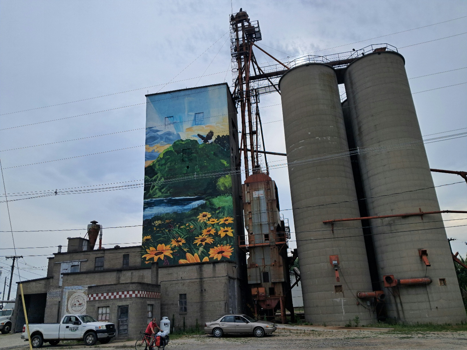 Flat and mostly straight roads, except when following a river, with light rain, characterised today's ride. Some quiet but typical rural towns on the route. Not much in the way of a decent grocery store, Dollar General being the only store that hasn't pushed off to some mega mall just off an interstate. Well done Dollar General. One store, in Grand Rapids (Ohio) even had veg. Excitement was at a high at that point. We got going remarkably early - waking up at 7.15am and being on the route by 8.40am. Warm and humid with occasional light rain. Through Pemberville, then just north of Bowling Green, then Grand Rapids (immense excitement over seeing an organic lettuce), then Napoleon (named after the original Bonaparte in 1832), famous for its soup (Campbell's) factory, then through Florida (a little town, formerly the Native American town called Snaketown) to the campsite at Independence Dam State Park where we're in a rather primitive camping area with rain tumbling down, occasionally heavily. This area was known in the early days as the Black Swamp and I can see what they meant. A Canal was driven through here almost 200 years ago and that is one side of us, on the other is a large muddy river that doesn't encourage swimming. It has been dammed to provide water for the canal. Effectively we have water both sides of us. There is no drinkable water and the toilets are portaloos. Ah, there are times when you long for the comforts and conveniences of home.... The canal was a winner for the second half of the Nineteenth Century, you could get all the way from Kentucky to New York by canal, then the railroad came in and the canal towns slowly disappeared and the canal became a muddy ditch. In the UK it would be full of boaters I guess... perhaps with even a gorgeous canalside pub with a range of local beers... ah but I fantasise... we haven't even got water. The charge for camping is $28 plus visa transaction charges. I'm sure they were better value ten or twenty years ago. I predict an early start tomorrow! The photo is a grain silo with a great mural. Grain silos are every mile or so around here.