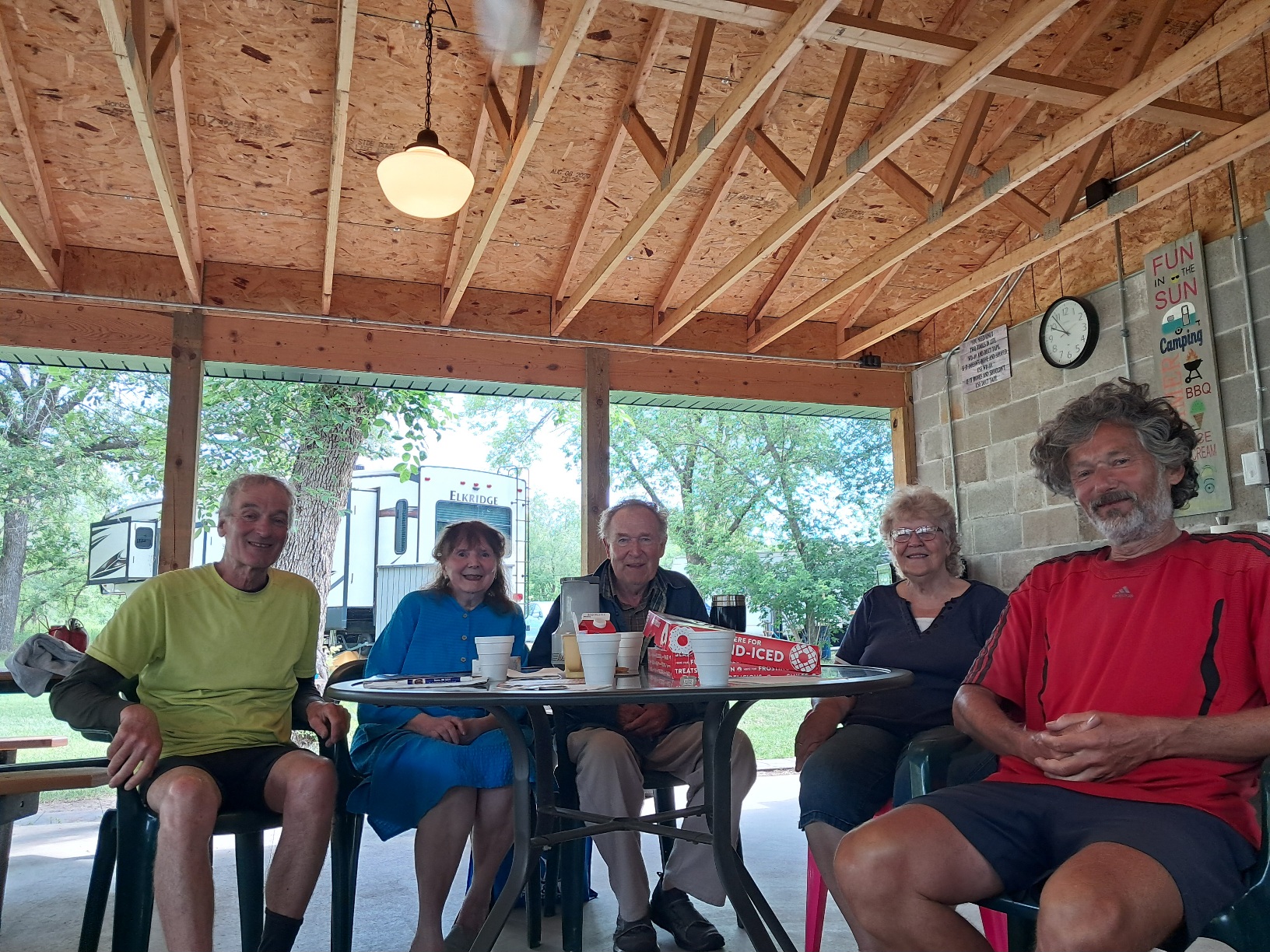 Our day started with a great conversation with Don, of Don's Lakeview RV Park, Nettie, a lady who had travelled very widely in the UK and lives nearby, and Don's wife, who brought very kindly brought cakes, essential to covering mileage. Nettie has visited England for many years - even the moor above Haworth where wutheringbikes.org.uk was dreamt of - near High Withens. She has a fascination with British history, writing and researching. A few years ago some British west to east transAm cyclists were here - military and doing a charity ride - and she told us about them. As soldiers they fit into the pageant of history well - regiments, royalty. We heard that Biden had left the presidential race in favour of Kamala Harris. A woman president... The group split over who to vote for - but Trump's position on Ukraine was a worry (will he hand it over to Putin). Nettie clearly thought her regular trips to the UK were over but we hope she makes it again. Don had dutch origins and his wife had Norwegian roots. There are lots of connections back to Europe. It was nice to think about cool, damp places on a day that promises to be rather hot.... The wind was behind us, more or less, so we sped through various small towns to Fergus Falls, about 44 miles away. The only problem was the jointed roads - concrete overlaid with tarmac - the joints make our wheels go clunk rather alarmingly - they've got 2000 miles still to go. We were on a bike trail much of the time - a bike trail that started at Bowlus so 100+ miles of bike trail.... We got some lunch in the supermarket right in the middle of town, there's a lake, called Alice, near the supermarket so we sat in the shade there, it's not easy to hang around in the sun.