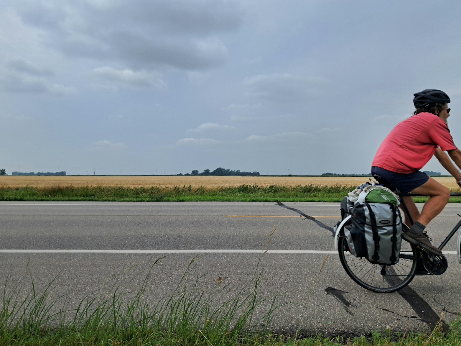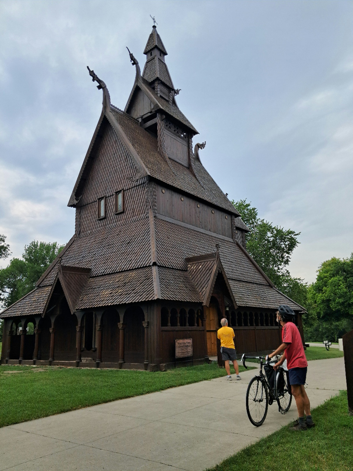 We went past a replica of a Norwegian stave church - Hopperstad Stave Church replica. The area had many Scandinavian migrants 150 years ago and their descendants are proud of their roots, huzzay. Eventually after much slow map reading we got to Fargo and even the town centre. Rather impressive with a super bike shop (yet another inner tube, sigh) - and a large Wells Fargo bank which must have something to do with Fargo. Some nice looking pubs as well. A city centre with life. We cycled out to the edge of the city and did the third section of today's ride - to Kindred, a small town about 25 further miles on. We shopped at Hornbachers groceries (as usual I slightly upset the bagging person by asking to not have a plastic bag - and there's no obvious way of recycling them around here). Jets were doing formation flying over Fargo - neat tight diamond shapes of four jet planes. And a loop the loop too... The sky looked a bit threatening - modest thunder was predicted. The roads are in a grid pattern so we went something like 10 miles south then 8 miles west and then 7 miles south, with the southbound bits being onto the relatively light south wind. It rained briefly once. Pythagoras theorem could work out how many miles would have been saved by a direct road... At Kindred we are now camped in the city park, as usual we were too late for the swimming pool. But a 6pm finish is not bad. Peanut Butter Porter was again drunk, with salad and very seedy wholemeal bread, plus chilli beans. It's a varied diet. We are currently just here.