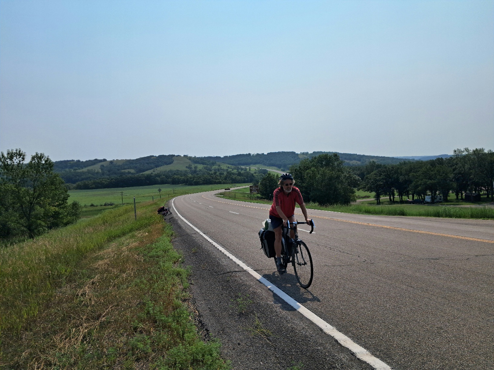 Those thunderstorms have turned up but at Gackle, subject at this very moment to a severe thunderstorm watch. But no tornadoes so that's a relief. I'm waiting for the storm to abate, sitting on a sofa inside the HoneyHub cyclist accommodation having just drunk a cup of Earl Grey tea. The flashes and thunder and blasts of wind are reducing but not quite enough yet. The tent is out in the storm and looks OK though and it is neither flooded nor blown over. We set off from Enderlin at about 9am, visited the Dollar General for food because it's 73 miles before there's much chance of food or water, and the heat is serious enough (perhaps 30 centigrade max with fair humidity). Then off into a green sort of desert. Rather picturesque on the whole - small lakes, big fields mostly of maize, gentle undulations with three bigger dips - particularly pretty at Little Yellowstone.