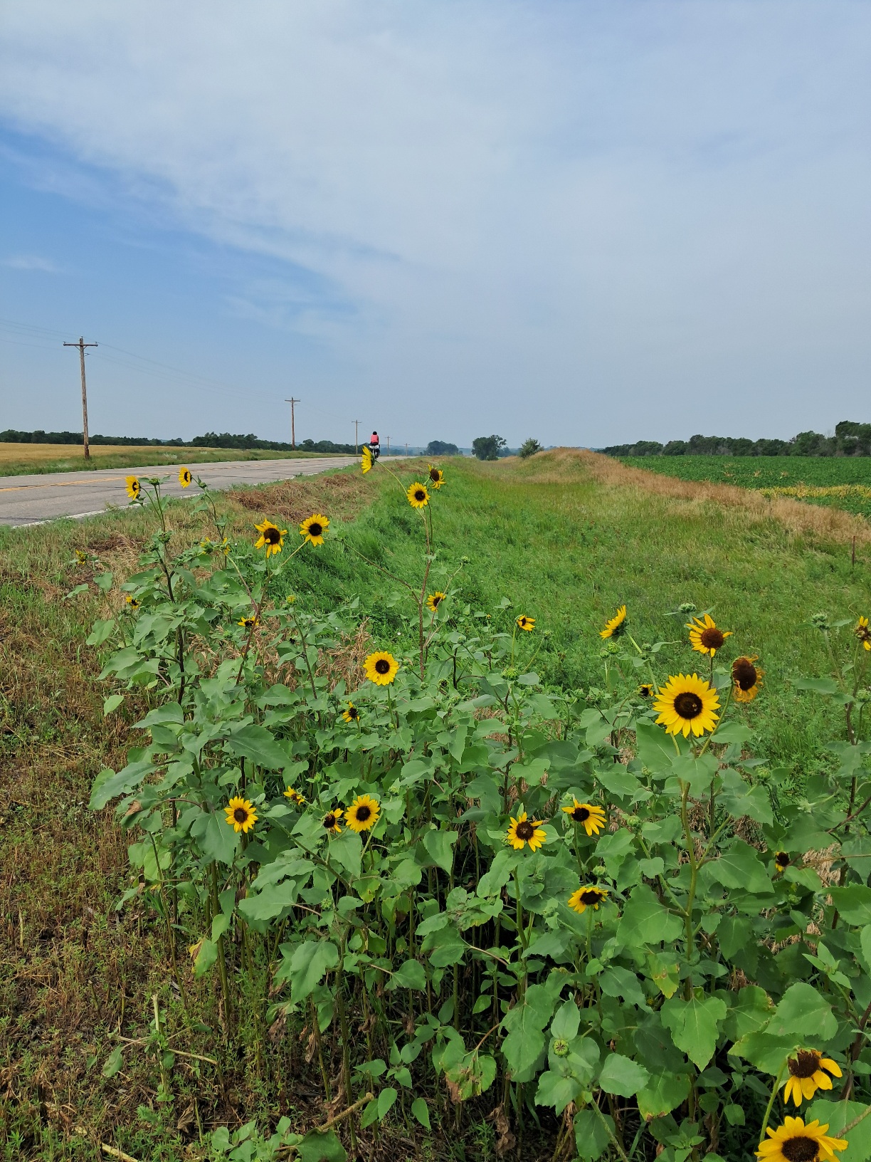 Today started with a thunderstorm which made our departure rather late. I discovered a small tear in my sleeping mat which had gone flat overnight, the sleeping bag has a zip, of course, so perhaps that did it. I glued it with inner tube patches. It is best if we can carry the tent dry so we let it dry off, the thunderstorm took ages to move away, eventually we decided to cycle while the last of the rain fell. Our first ride was just to the shop and buy a few Miss Debbie honey buns to get the wheels turning. Miss Debbie is a bit like Mr Kipling is in the UK - except less varied and less subtle, with impressive amounts of sugar and fat. I imagine the original Miss Debbie must be 40 stone and embittered... The wind was a northerly and that was a headwind for much of today. So we ploughed along past Moffit, then turned west along Moffit Road for some miles. The scenery is getting hillier and more parched. Then more northerly roads to the edge of Bismarck, now getting quite hilly, with bigger hills in the distance, past the University of Mary (Mary Fieldhouse), along the bike path that connects the University with Bismarck proper, then off to the General Sibley Park where we set up our tent in a wooded oasis of water, ice lollies (coconut) and shade - the sun is pretty hot today once it broke through the cloud. The next camping is some way off and we'd had a delayed start due to thunder. We went to get food from Natural Grocers - an organic focussed supermarket, very impressive and with just the sort of greens we don't get enough of. The short queue at the supermarket cheered when I said I was doing a transam on my bike. That's the mark of a good supermarket! And a Porter beer - Deschuttes Brewery, a beer which we liked on our first visit to America 20 years ago. The south side of Bismarck is subject to big development schemes and we cycled around the new housing development to avoid the road works. Saw two cyclists - one on the pavement though we had seen a 'share the road ' sign, and a boy who had his fishing gear neatly set up in a pull along baby cart - very practical. The Missiouri River isn't far away, we'll cross it tomorrow. We need to find a way around the roadworks. The photo is from the Moffit Road - wild sunflowers growing by the road. We are here.