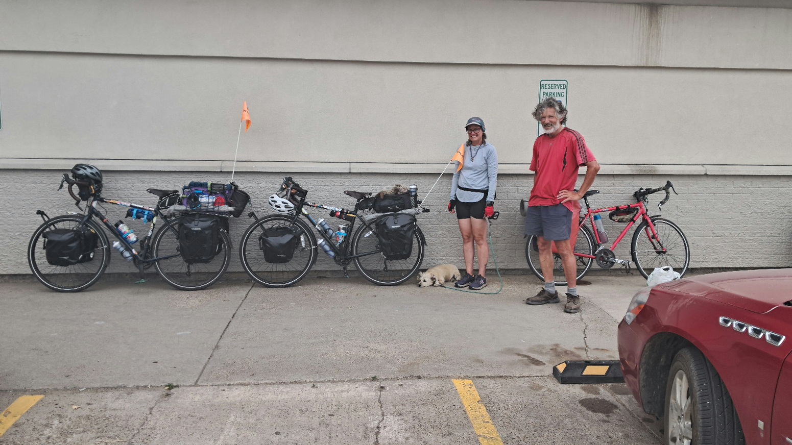 Outside the store were Heather, Frank and the dog Mary - see photo, our first travelling dog. They are the people who were next to us at Wibaux. They have recently started a two year journey travelling by bike (though they may do some walking trails - they have done the Appalachian Trail). The dog did get a run already today on that quiet road where we saw only one vehicle.  She sits in a dog basket on the back of one of the bikes. They have cooking stuff - super compact stove. I'm always interested in those - tea whenever you like, home cooked food... They have a blog on the 'journi' app called Happy Trails Cycling Trip. A two year trip is somewhat epic. That really would be leaving the garden to look after itself. A recent photo of a pumpkin in the garden at home had sent me into a whirl of gardening reflections (our plants perhaps need us less than we think). Sitting in a park by the river (River Yellowstone so flowing down from here to Yellowstone Park) Guy discovered he had a puncture (small staple). This took about an hour to fix. Yes, Guy is slow but steady and careful even when just putting in a new tube.... But a park is the place to do this. Eventually when we set off I had a puncture - but in the front wheel. I fixed it in ten minutes (small very hard thorn - gatorskin tyres should beat most thorns though). Ten minutes not an hour, hmmm, well front wheels are a bit easier I suppose. We did the miles to Circle steadily, breaking our cycling to eat apple crumble (Reynolds Market is pretty good) at the roadside near Lindsay. The motel was tempting but a bit expensive ($80) so we set up our camp in the city park. This is a rather large area, with the usual swimming pool that closed before we got here, haha! Once more I gazed at deep blue water through a fence standing in the parched earth beyond. The park is pretty good with toilets and water but no showers. The forecast rain is just setting in at nearly midnight. We are cosily camped between a pavilion and two trees, sheltered from the NE wind. We are here