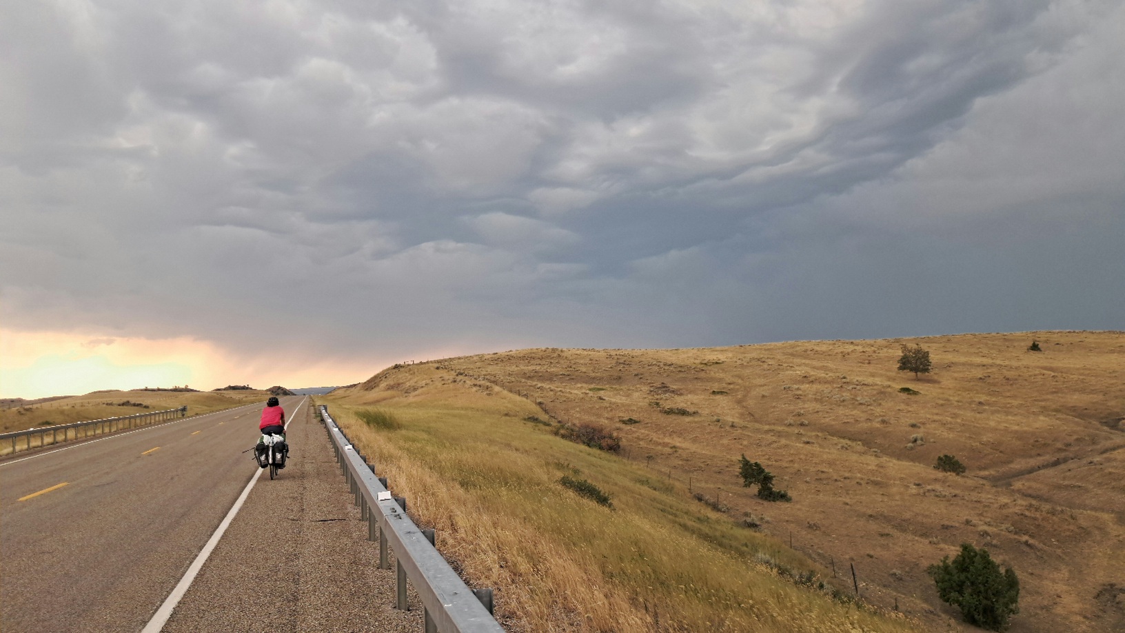 Today was spent crossing 77 miles of impressive emptiness. There were fortunately two places that broke the bleakness of the journey. We set out from Jordan at about 9.30am having packed up in the Kariotis Park and then visited the grocery store to get some food for lunch. The wind was against us all day but never very strongly. So we did about 40 miles to Sand Springs where we found Tracey and Jack running the grocery store and filling station, with a large dog called bowie. She made us milkshakes, refilled two water bottles and directed us to the cyclists'' journal which detailed 20 years of visits by transam cyclists. We recognised some names - people that we have met since starting. The register includes people that stayed at Sand Springs as well as those who found it a useful temporary pause to fill their water bottles and drink milk shakes as we did. It is a place that contains a goodly number of hens and places to camp - but we need to use the afternoon for cycling. But Tracey is closing down in order to go and start a new venture - a motel near the Roosevelt National Park. Tracey said there is storm warning, which seemed unlikely to us since the sky looked blue with just a touch of fluffy clouds. We set off again and indeed after ten miles there was a growing haze of dark clouds on the horizon straight ahead. Could we make it to the shelter of the rest area before the storm? Seemed unlikely since we had ten more miles to go but those ten miles were mostly downhill into a large valley. Well we sort of made it - the lightning (mostly horizontal forks between clouds) and thunder started in earnest with about three miles to go and within sight of the rest area's solid building there was a tremendous downpour and the wind went up to a gale of a headwind. We got into the shelter a bit wet but glad to be out of the storm. When the storm abated we ate our very late lunch in one of the outdoor shelters watching the blackness travel away to the east. The temperatures recovered and we set off - 20 miles to Winnett was covered without further rain until we got within sight of the town when the next storm arrived. It was really just rain and fairly moderate. The campsite has closed down, no response to our phone call or signs. We tried the motel - it appeared to be functioning but had a no vacancies and no one appeared when we rang the bell. A man walking past said it was not open for business. So the only resort we had was to pitch our tent in the park in the rain - though it had more or less stopped by then. We should have been able to use the showers and toilets in the swimming pool - open until 8pm (we arrived at about 7pm) but, unsurprisingly for Winnett, it was closed. Perhaps it always closes when it rains.... Once again we can see blue clear warmed water... through a fence. The shop closed at 6pm so we ate a pizza at the Winnett bar - still open! Then we retired to our tent to sleep. To top it all, the park claims to have a sprinkler system that starts at 8am, so we will need to remove our tent by then. I didn't believe Winnett could organise an efficient sprinkler system and was for ignoring it - the grass looks mostly parched. I was partly right - a few nozzles are firing water in various areas but our tent would have only been very lightly sprinkled - and a towel or a plastic tub would have dealt with that sprinkler. The result of all this sprinkling is a piebald effect - green with baked areas. We're waiting for the bar to open and feed us our breakfast. We are here.
