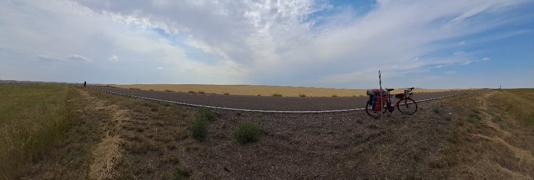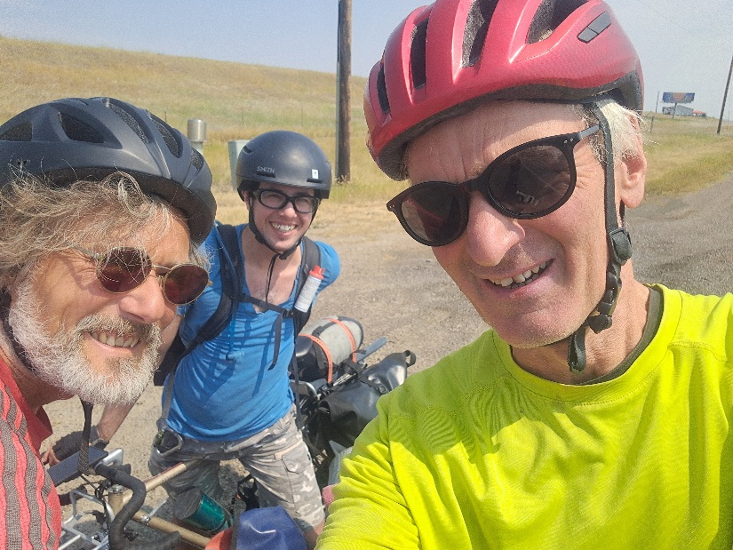 Before the interstate drained off the traffic we met Art, from Chicago, doing something like 4000 miles in an enormous round trip to visit his sister in Seattle. Plus doing some climbing as well as chance allowed. He was riding a similar classic bike to Guy's. Plus a neat collection of camping stuff and climbing gear. Wow! He gave Guy a classic bike sticker, Guy's bike has needed stickers since it had its respray ages ago, I got a rock and roll sticker. My bike is now further ornamented. Art has a proper blog here. This is the fourth sticker of the trip and the first from a fellow bicycler... thanks Art. I took the second selfie of the trip and the photo is mostly of me, hmmm perhaps that's enough selfies this decade. We continued in increasingly hazy sunshine with a big thundery cloud way to the west. But in an easterly that seemed OK since it wasn'tconverging on our path. Pleasant riding - we paralleled the interstate but the road we were on had almost no traffic. At one point it got a bit "jointed' with clunks as you went from one section to the next, bashing the heavy back wheel alarmingly, but overall a nice 50 miles or so. No great scenic moments except the effects of haze and sun over a patchwork of large fields - large wheat fields, prairie, harvested grey or straw patches. The sun was increasingly veiled. We arrived at about 6.15pm, shopped (yet again I puzzled a shop assistant by refusing plastic bags) and went to the Pondera Resort RV and Campground. The resort bit of the name is silly. This is no resort, no swim pools are available, no baskets of flowers adorn the area, no trips to beauty spots are available. It seems mostly to be long term lets for caravan / RV owners, the ones I met were people using it as a base to go to work. Utility not recreation. But expensive at $32. The rain came back heavier during the night. We are here.