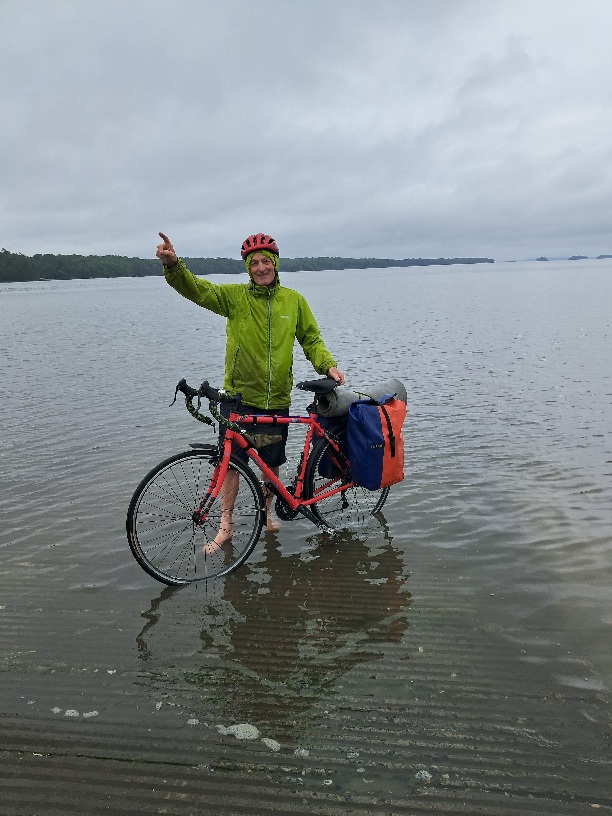 It was raining lightly as we woke up and continued in that style all day. White Beach campground has a small swimming lake which was steaming gently in the drizzle so I started the day with a swim. Pleasantly tepid. Is there a hot spring under the lake. Although raining, the weather was not cold though. We needed to reach the sea because no true transam can occur without a wheel dip in salty water on one side of a continent prior to any hoped for dip at the other side. So we went the few miles down to Wharton's Point where the dip was ceremonially completed. Two women were looking at the side of the jetty and they showed us a horseshoe crab with a strange semi translucent shell - dead but remarkable. Apparently they can grow to a huge size and have changed little since the Devonian (400 - 500 million years ago. We set off through Brunswick again, bought oil at the bike shop and food from the local supermarket, Hannaford's. Then off via a rather complex route to the west. The route went along the hard shoulder of a busy road through to Lisbon then Lewiston and then we got a bit lost around Pownal, we had to go cross country to get back on route at Shaker. Then up to Poland where Poland Spring campsite provided a site for our tent for the shocking sum of $73! Well, we were running out of daylight so that was that. Hmm, daylight robbery...?