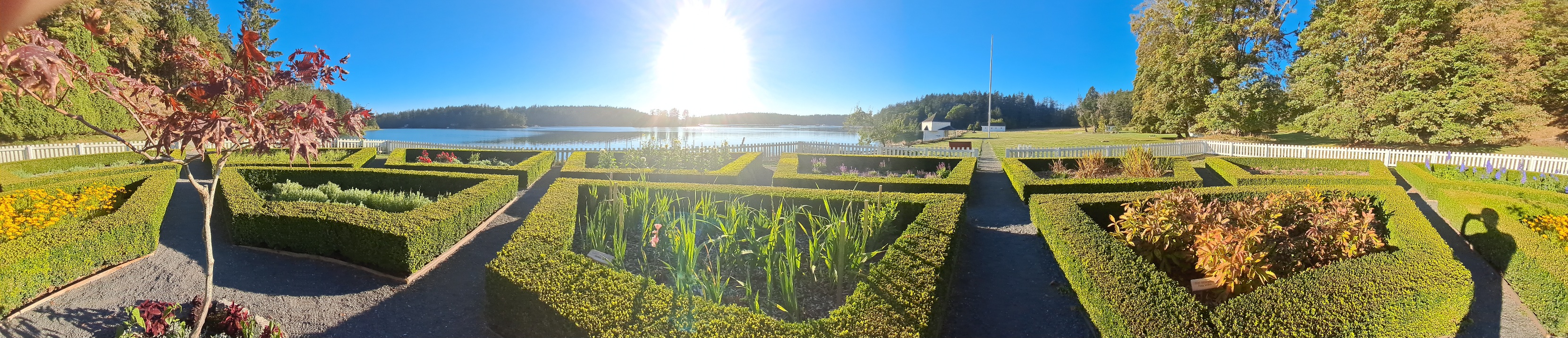 The obvious thing to do with an island is to cycle around it, reaching a few notable points and features. We had heard of the War of the Pig - a war between the UK and the USA over the ownership of these islands. The agreement to make British territory (Canada) start at the 49th parallel did not deal easily with Vancouver Island and various smaller islands - there was a reference just to the straits between Vancouver Island and the mainland USA as the dividing line. Eventually a pig was shot on this very island and it brought to a head the question of jurisdiction. Well obviously they should be British but an amicable stand off developed with British and American soldiers occupying camps at opposite ends of the island but exchanging dinners rather than bullets. How wise. International arbitration (the Germans!) awarded these islands to the USA after about a decade or so. There are plenty of islands to go round - indeed there's even a Canadian set of islands just north of here with whale watching and ferries, so all ended happily. We visited the American and British camps, the British camp wins as the neatest parade ground and best gardened, with the best social life, factors I guess the Germans sadly ignored in their arbitration. We cycled anticlockwise around the island, spotting two lighthouses (sadly a bit small when you are used to Pembrokeshire's magnificent lighthouses). No whales were spotted. The coast has some super kelp strewn beaches especially in the south. There's a Cattle Point lighthouse which we saw from high up on the coast road right at the southern end of the island. Lunch was very late - in Friday Harbour where we did a lot of shopping with the idea of whale watching and reading tomorrow. Various seaplanes came and went. Then off around the northern end of the island past English Camp where we Brits dug in during the War of the Pig. That's where the beautiful box hedged garden was - by a picturesque inlet. Then a few miles more and at our tent for dinner- we had found Sam Smith's Oatmeal Stout in Friday Harbour so we drank that with salad. Some new hiker bikers were setup in the campsite - Zak and Dillon from Portland doing various islands with their bikes. Zak talked about surfing in Oregon where he has a 90 mile trip to his favourite surf spot... wow, made me feel very lucky in Pembrokeshire. Sea temperatures lower too.... Ploughed through half of 'The Winter Queen' before sleep. We are still here. Tomorrow we are staying at this campsite, hoping to see whales and then the following day we begin the journey south towards Seattle. The photo is a 360 photo (try joining the two ends of the photo - the yellow coreopsis flowers - they fit together) of the English Camp garden, taken from the centre.