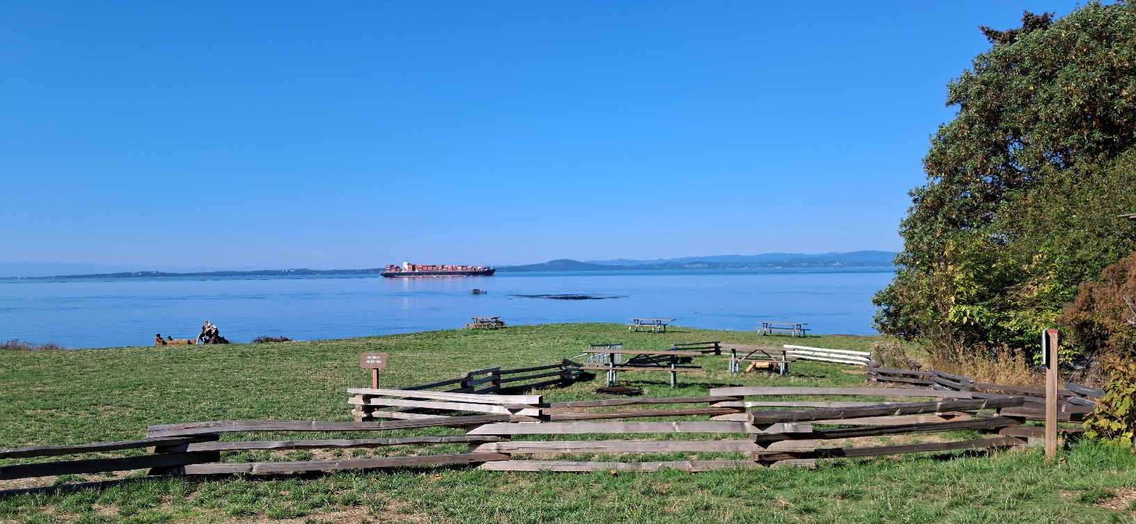 Staring out to sea makes you aware of the considerable amount of container traffic there is heading up the straits to Vancouver. Huge ships pass the campsite day and night, their distant beating engines vibrating the air for an age. Fridges from China, along with a small sea of plastic toys, gadgets, stuff... Wonder what the effect on the whales is? I wake up to hear them.... We also had some time to consider how wandering a route to Seattle we should take - at least two days but perhaps a little more, possibly joining the route from 20 years ago - certainly enjoying the same bainbridge park for camping. On the other hand, urban pleasures of bookshops, art galleries, gardens, museums and veggie restaurants have been much missed and there's a wooden boats festival we may well want to spend time at - in Port Townsend... We are still here. [The next day] As we were packing up a group of dark shapes about half a mile out to sea, where the deep channel is, moved to our left, south, just breaking the water, a pod... Well it may have been orcas, something oceanic...