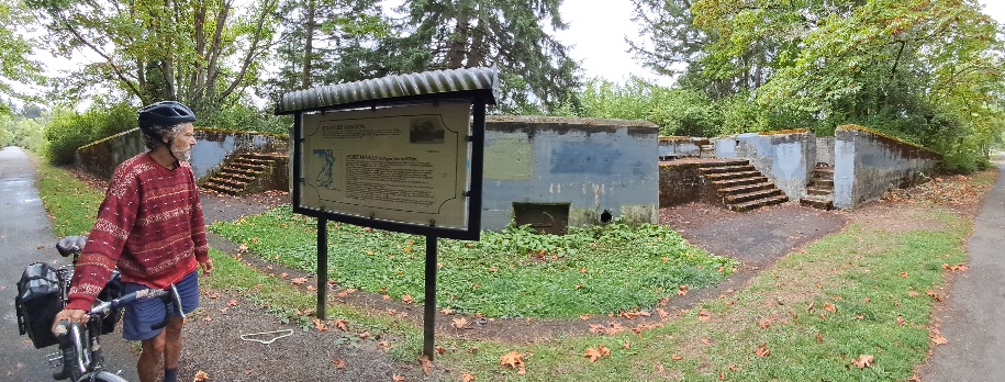 I managed to lose my Julian Barnes' The Man in the Red Coat at Safeway when doing the shopping last night. I took it out of my pannier to get the shopping in and left it on a wall. This morning we went back - just the plastic bag it was in was still there. I hope whoever took it reads it, it is an expensive hardback to buy new, though I bought it for $2 from the library sale and intended to donate it before flying, and it is well worth reading. So this loss doesn't matter - it is too physically heavy to go on the plane home and it is in the local library system in Pembrokeshire. So I am now reading News by Alain de Botton, $1 in the Bainbridge library sale. It is a great library and makes me feel ashamed of Pembrokeshire's current desire to cut our library services... isn't literacy vital? As vital as social services I'd say. We continued on to Bainbridge's southern tip, a road bordered by houses, with the usual view to other wooded islands. A seal was swimming offshore. From there a bike path goes past yet more redundant (redundant at point of building I think) concrete, defending 19th century Puget Sound (there are Naval Docks at nearby Bremerton) from... well, surely not us so I can only think Japan or perhaps Russia. The guns were never fired in anger on this location but I think they were removed and sent off to WW1. There's a nice park there now. Then through Lynwood Center back to Bainbridge Town - stopping yet again at the library where the flag was at half mast (9/11 anniversary) and we met Fletch, a Brit living in Bainbridge some of the year. He had a Bike Friday folder which has been used for some impressive touring - up the Rhine and then to the Med... and planning to do the west coast of the USA. On a small wheeled folding bicycle this is impressive. He is a cyclist of very much a like mind - he described cycling on the hard shoulder as cycling amongst the broken glass and dirt - indeed it is, but that's where the busy American driver generally thinks you should be. We are still here.