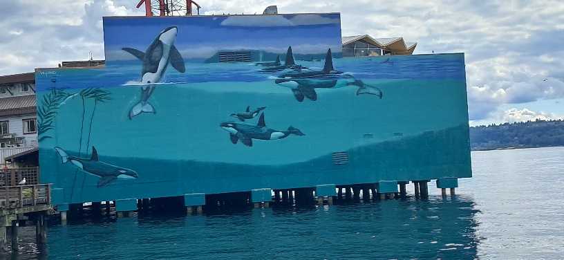 The fountain and plants amused us - and the sculpture of orcas. See photo. Then we visited a couple more bookshops on Pike Street but new books seem so expensive after the library sales... Pike Street Brewery was still selling Kilt Lifter after 20 years. Well it's a classic beer of what the Americans call Scotch Ale though Scots call it, I think, a 'wee heavy'. And sadly we saw no actual kilts - twenty years ago the Scottish presence was more evident. But the ferry home to Bainbridge was getting nearer - we didn't want to use our lights to get back to the campground. So back to Bainbridge and the bike ride back to the tent. On the way I got yet another book - The Salt Path by Raynor Winn, since I have nearly finished Alain de Botton's light and fanciful analysis of 'News' media (about to be donated to a little library box). Today's beer was Port Townsend Amber - a great sweet-ish bitter. We are still here. The photo is a waterfront mural of orcas.