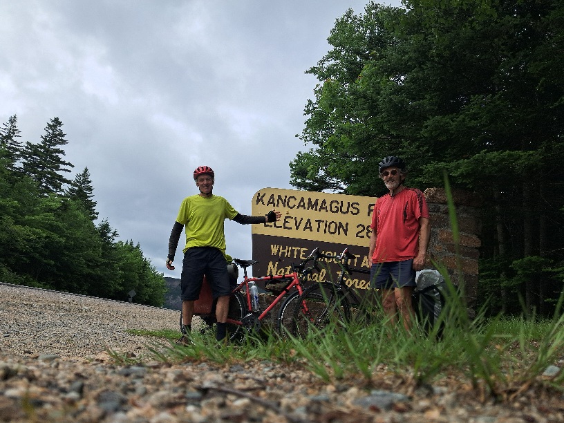 Waking up in a tent to sunshine is a lovely thing after a couple of rainy mornings. Dappled sunlight through trees. The mosquitoes were having lie in, gorged as they were on our blood, so nice and quiet. So we got off to an early start at 9.30am. This is good because you then have more time to look for a campsite at the end of the day- if the price is silly you can cycle on elsewhere. We hurtled along to Fryeburg - quiet tidy sort of place then, passing across the state line to New Hampshire, various versions of Conway, where we spent ages trying to find food shops. Turns out they are all out of town... We found the Family Dollar store. A rather downbeat store, but OK for the basics of lunch. The library looked beautiful though.... Then off to conquer the Kancamagus Pass. The route initially goes along the opposite side of the river to the main road. After about 6 miles it rejoins the main Kancamagus Highway, and we started to gain height with a steep climb starting after Champney Falls trailhead. The weather got drizzly, views of distant wooded hills opened up, and eventually we reached the col, 2855' above sea level. The big hills of the Appalachians stretched into the distance, soft in the slight drizzle. Then a great downhill, and our average speed crept back up over 10mph, huzzah, as my speedo reached 30mph plus. We reached Lincoln then North Woodstock where the cheap and pleasant camping at Maple Haven campground stopped us - at $37 it's the cheapest so far. Pig's Ear Brown Ale with a grainy bread and tomatoes was just what we needed. The Pig's Ear is brewed here in North Woodstock. The picture was taken at the top of the pass.