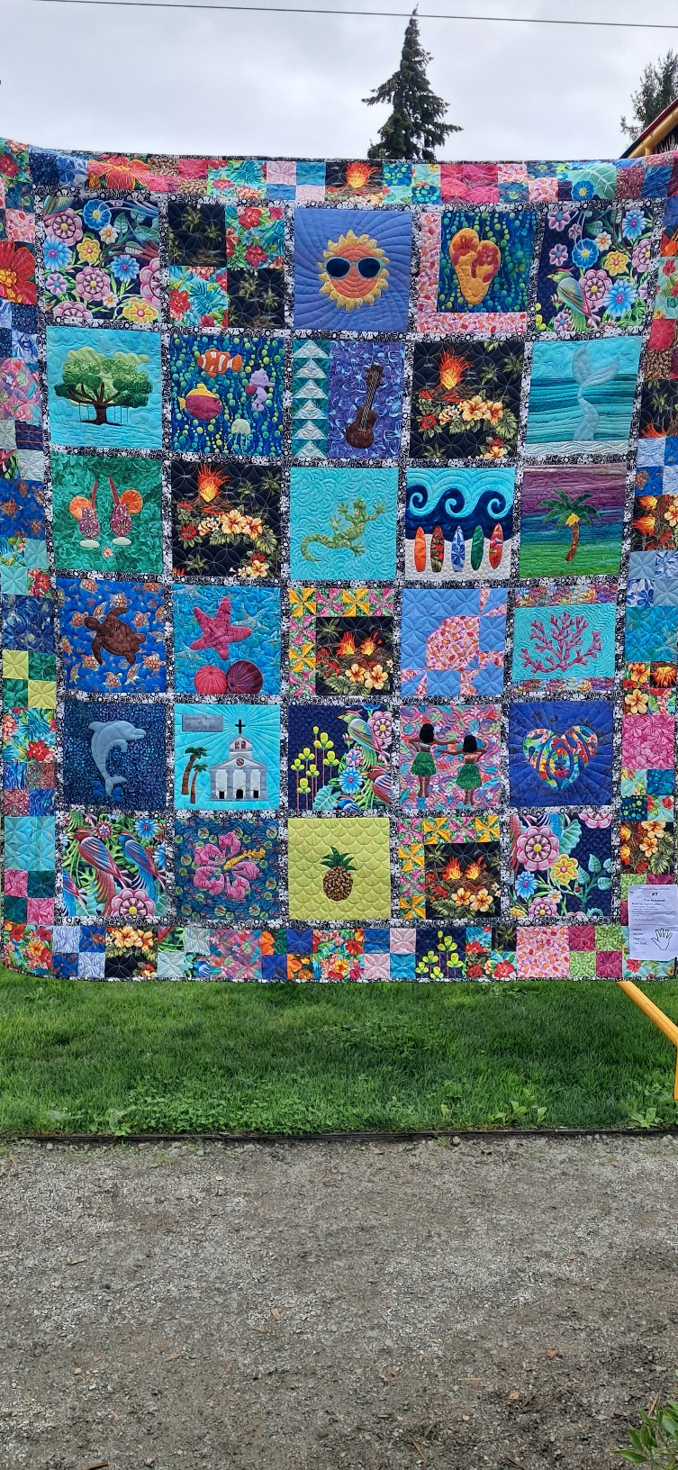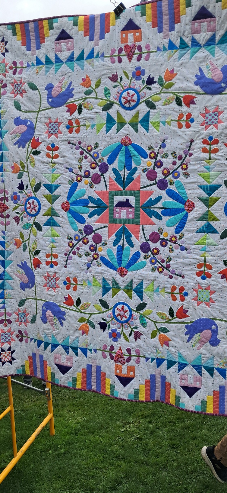We knew there were various things in Bainbridge that we should ideally see before leaving for blighty. These included the art gallery, the farmers' market and there was also a quilt display by the local quilting group - something very American and much appreciated for its celebration of many aspects of American life and its artyness. The Farmers' Market was great - local wines, bread, cakes, veg and even a display of bees just for the wonder of it (not selling honey). I bought bread and cakes and some nice farm shop bags, and admired the slice of a hive on display. The beekeeper made the point that although the honey bee is prized for pollination, bumble bees are indigenous to the US, more efficient pollinators per bee (though much fewer per colony) and also tougher - coping with a wider range of weather conditions. Well it's not a competition and bee keepers love both - as evidently did the man showing the slice of hive. We the did the quilts - marvellous collection of the traditional and the adventurous. See photo. The art gallery had a set of varied exhibitions but I found the woodcuts my favourite - scenes of NW Pacific life - a rowing boat on the water....